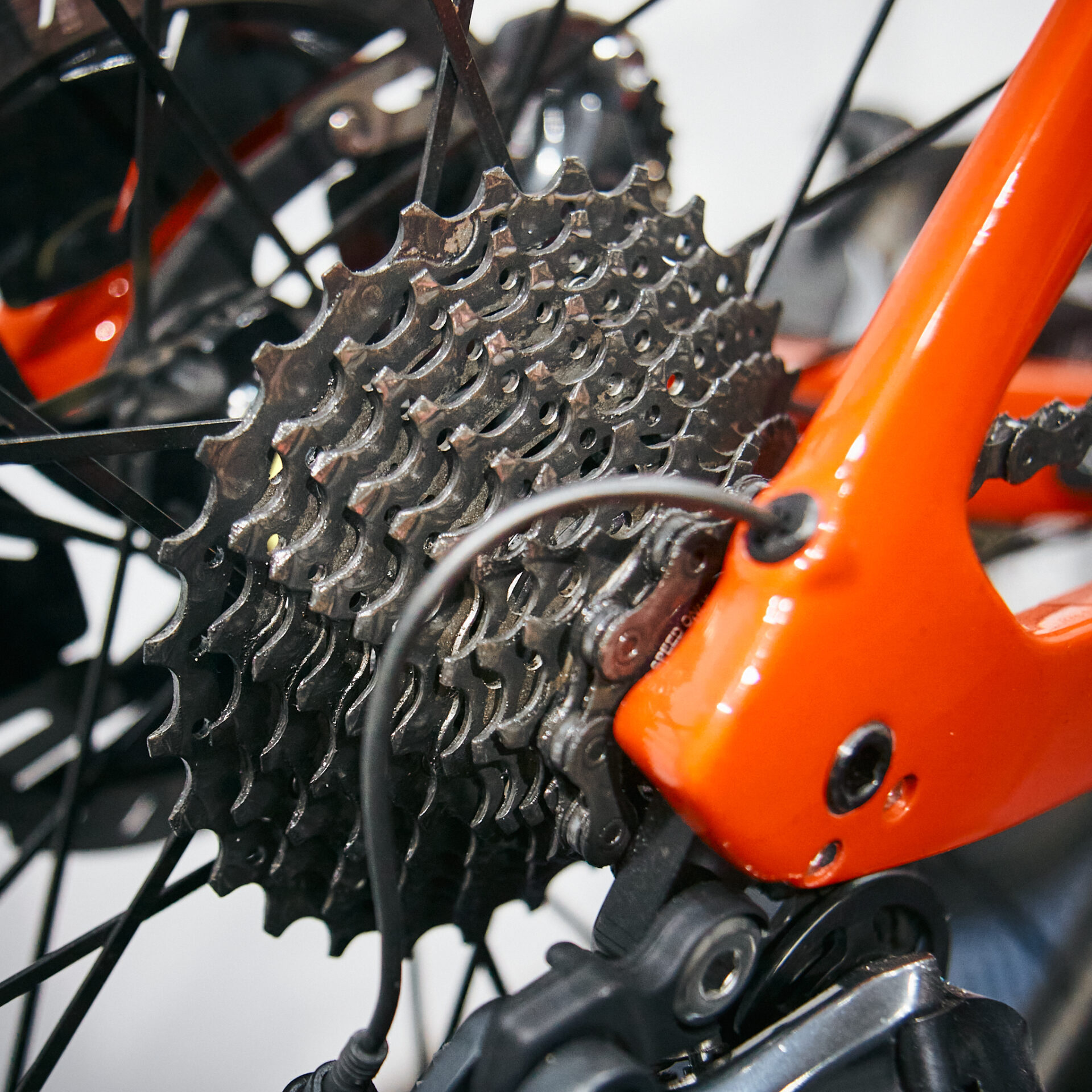レースや練習でガッツリ乗り込まれているため、チェーンステーやディスクブレーキ周りには、路面の泥とオイルが混ざり合った「黒いドロドロ汚れ」が付着していました。