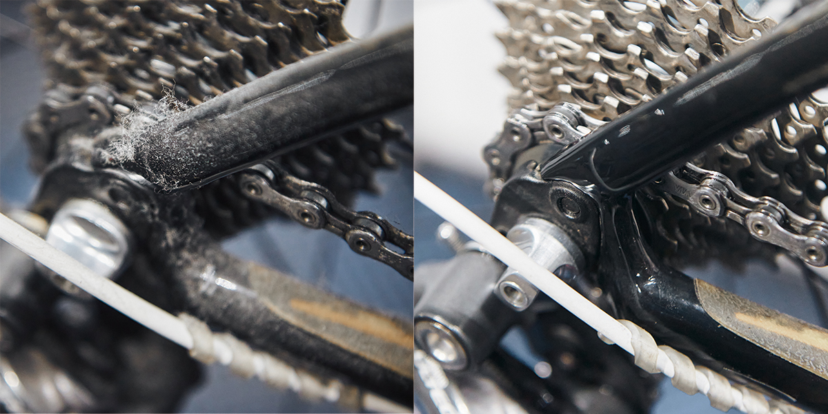 スポークの端っこに絡まっていたホコリもしっかり取れていますし、フレームの黒い部分が白みがかっていたのにくっきりとした色味に戻りましたね。