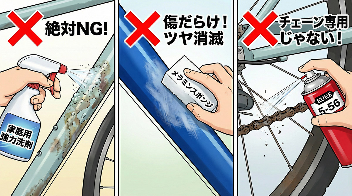 ご家庭にある道具や、間違った知識での洗車は、自転車にとって「拷問」に近いダメージを与えることがあります。特に多い失敗例を見ていきましょう。